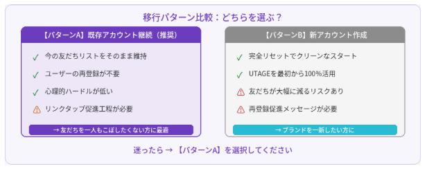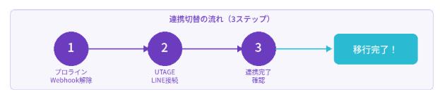 現在のLINE公式アカウントは残し、連携するシステムだけをプロラインフリーからUTAGEに差し替える方法です。